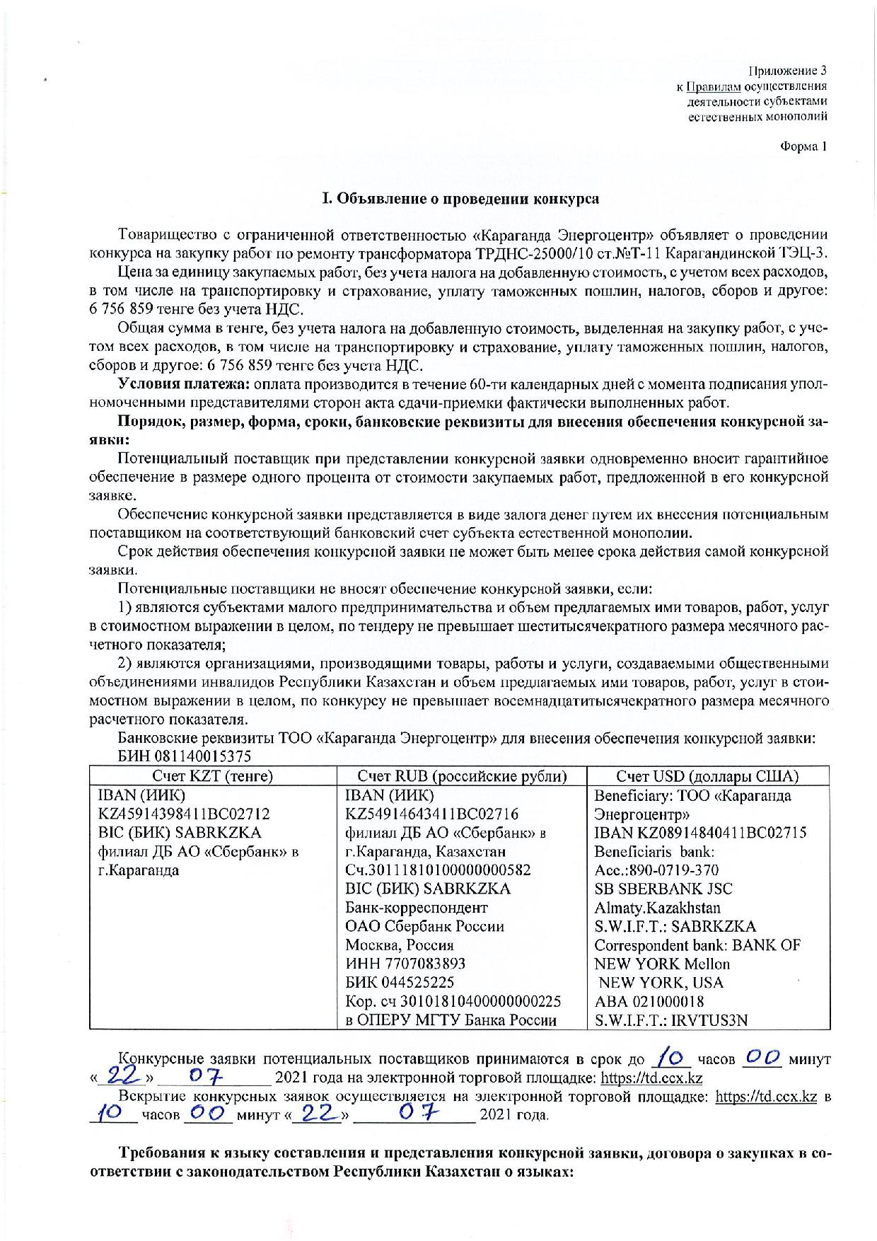 » ОБЪЯВЛЕНИЕ № CASPY.2021.ОК-623