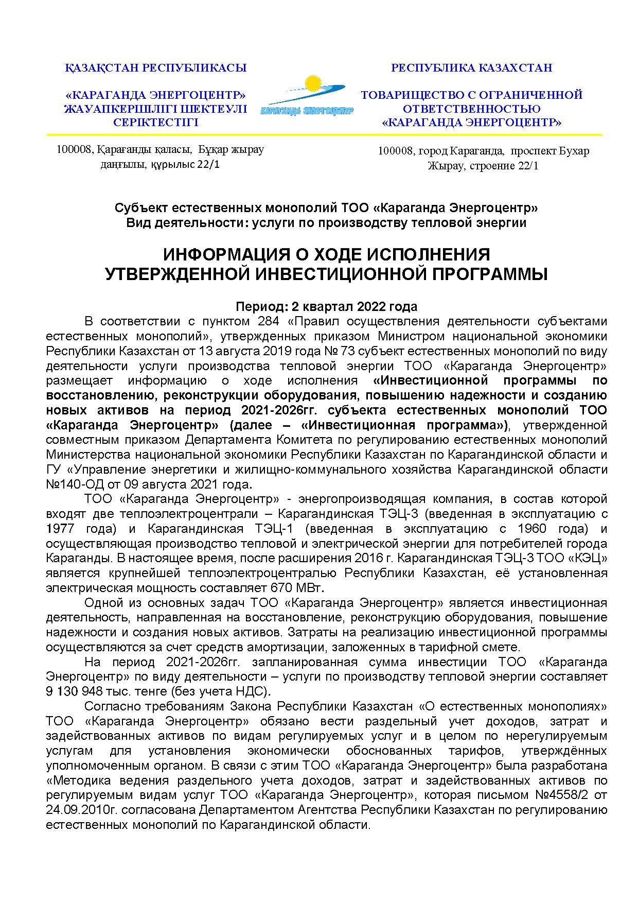 » ИНФОРМАЦИЯ ПО ИСПОЛНЕНИЮ УТВЕРЖДЕННОЙ ИНВЕСТИЦИОННОЙ ПРОГРАММЫ 2 КВАРТАЛ 2022 Г
