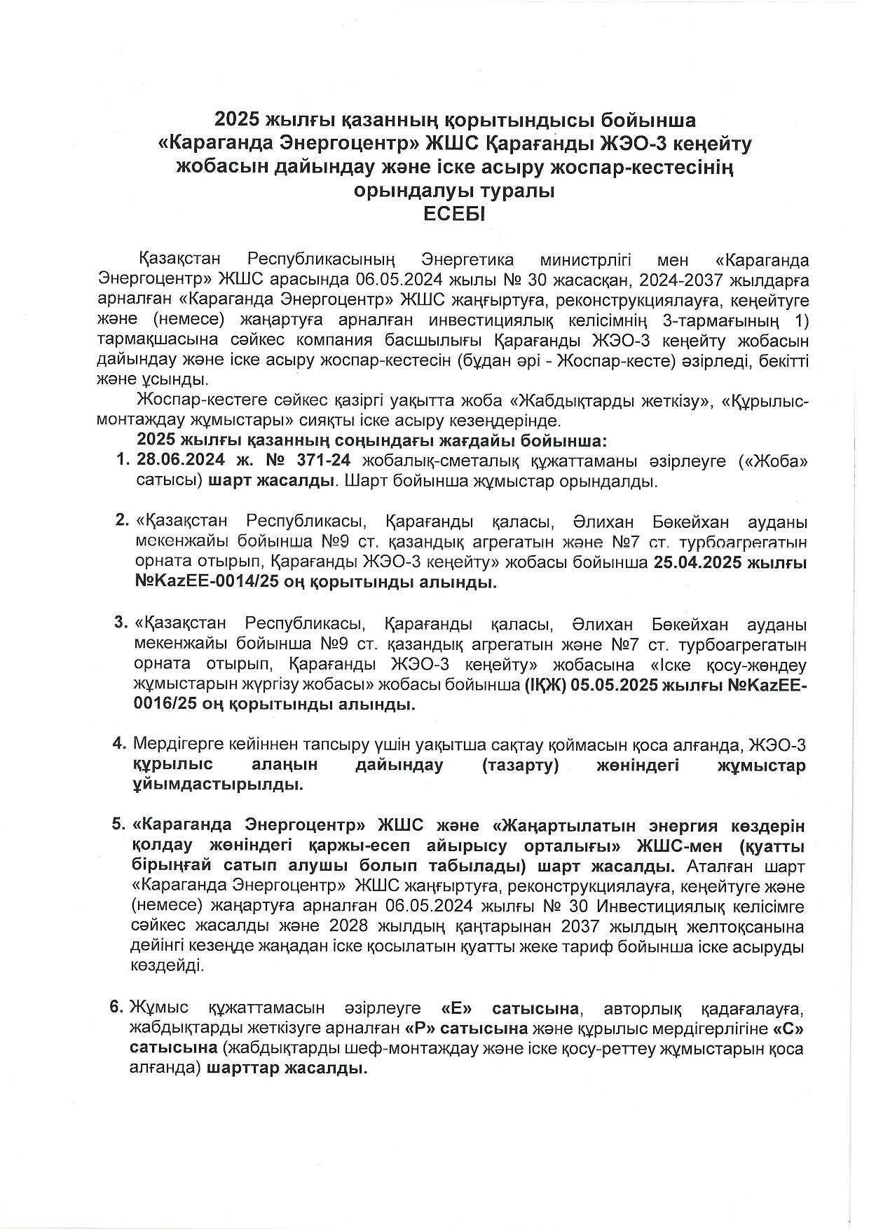 » КЕҢЕЙТУ ЖОБАСЫНЫҢ ЖОСПАР-КЕСТЕСІН ОРЫНДАУ ТУРАЛЫ ЕСЕБІ